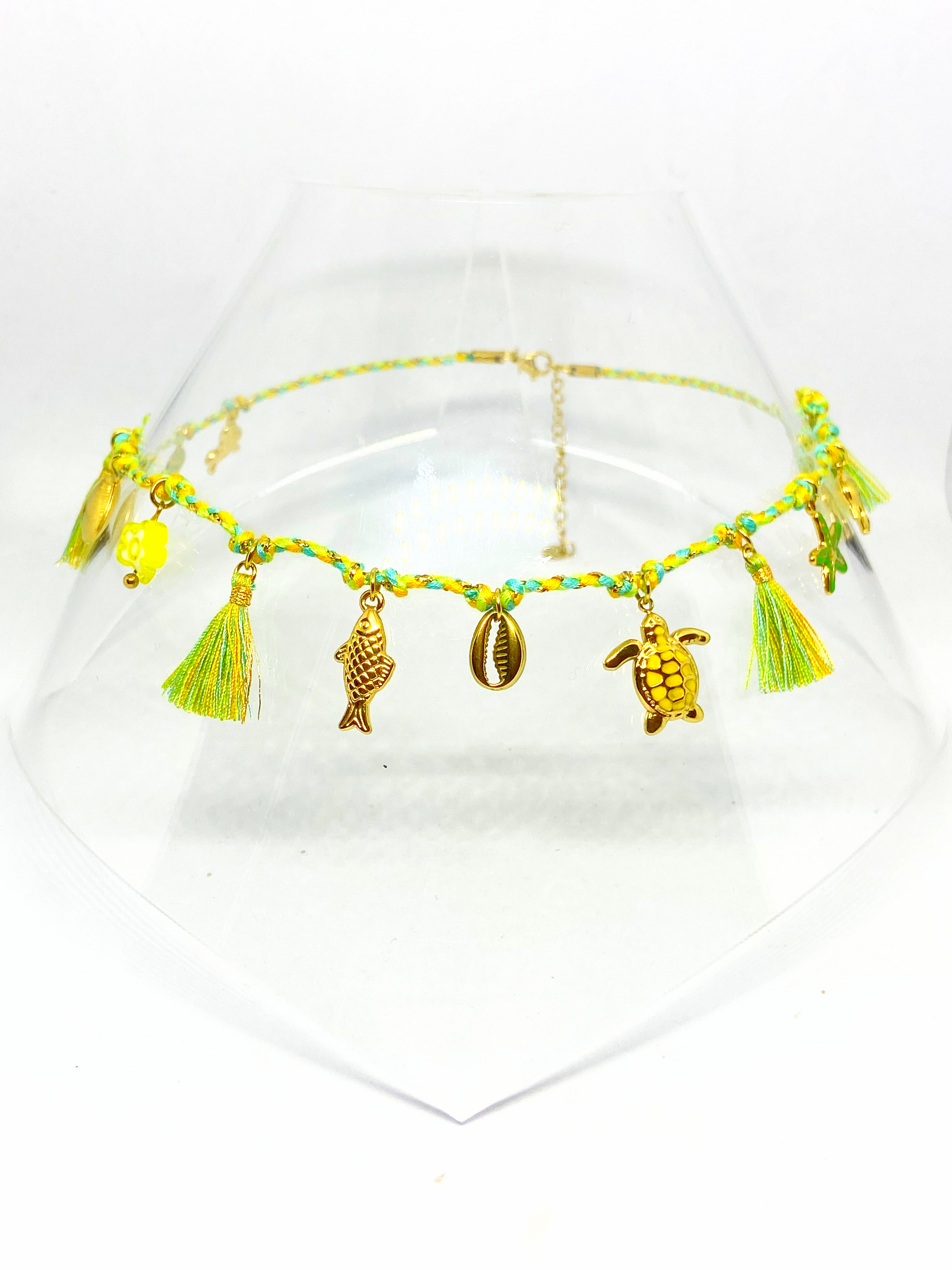 Collier en corde et acier inoxydable vert et doré à breloque